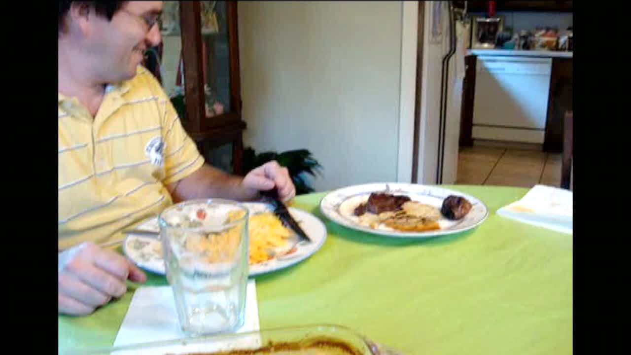 A dog with borrowed hands sits at the dining table in the living room and uses utensils to eat food off a plate.