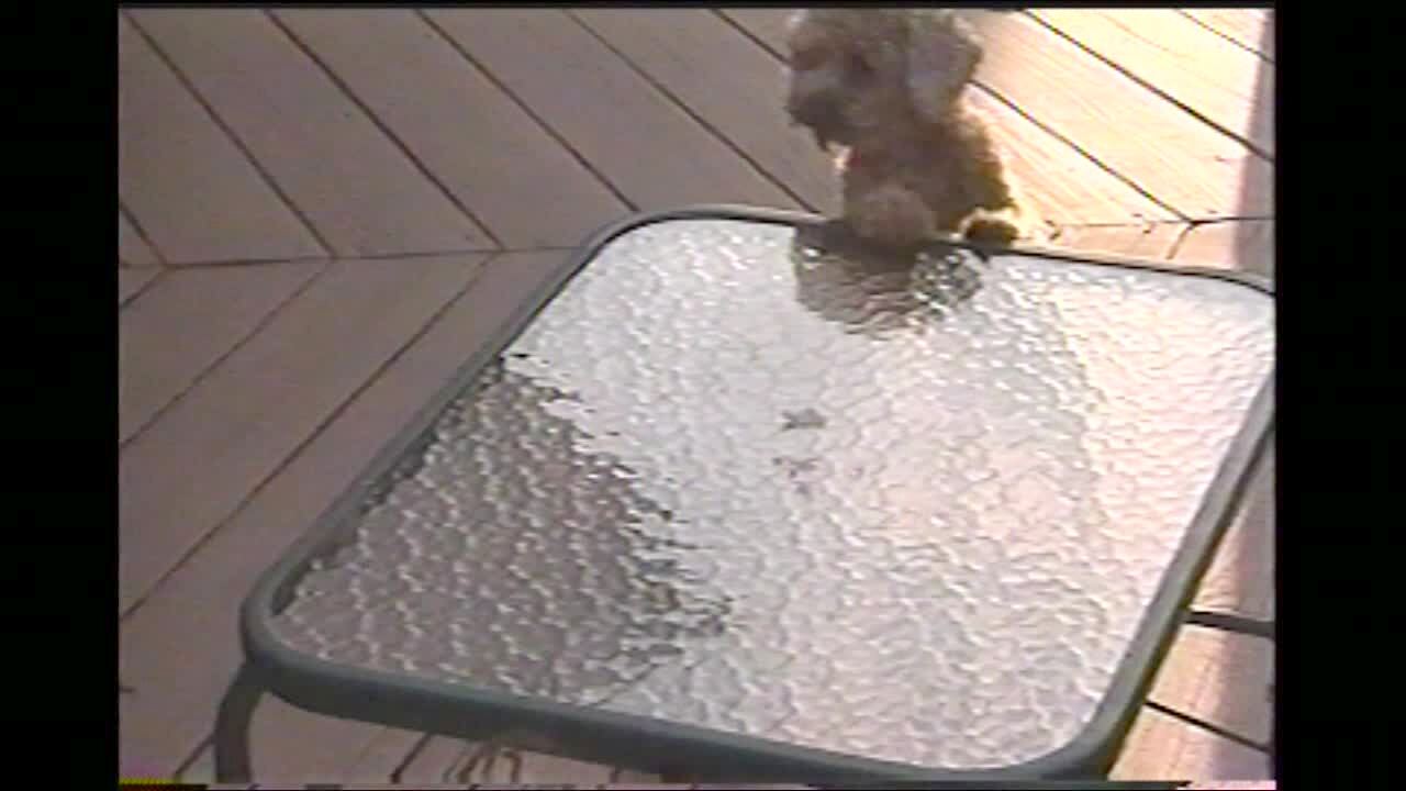 Dog jumps up and down next to table with his toy bone on it. Just see dog's head popping up over and over. Repeatedly.
