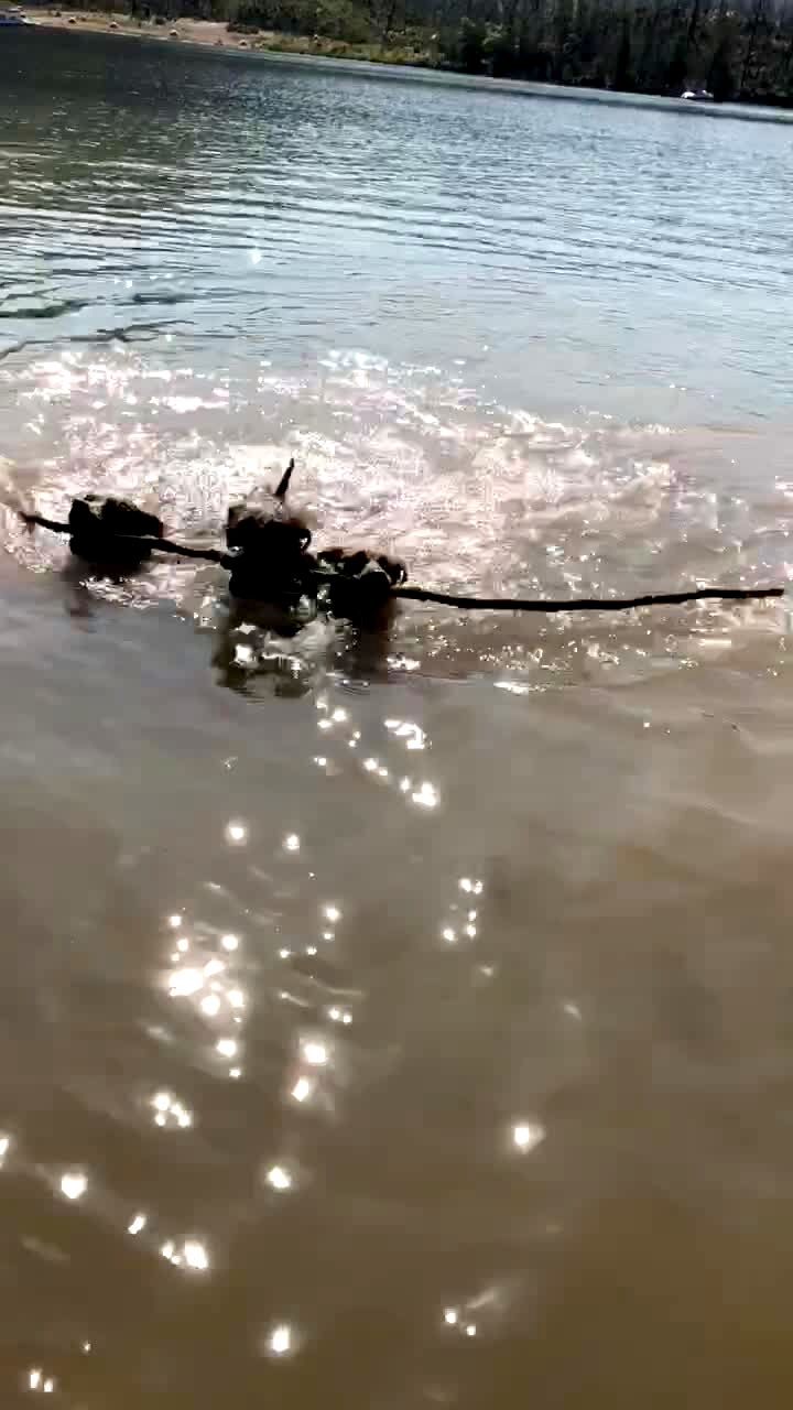 Two dogs jump on each other on a couch, a woman asks them not to squish another dog, then they jump off the couch to reveal a third dog under them.