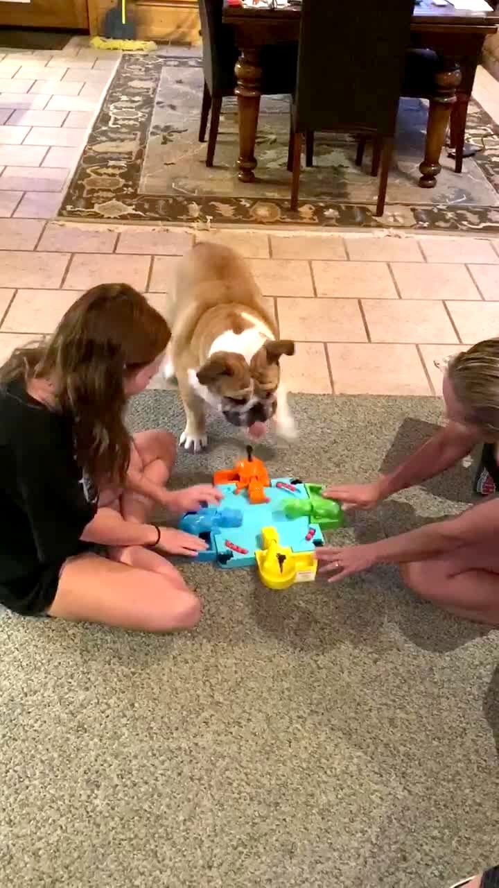 A bulldog dog paws at a game board as a woman and her daughter play Hungry Hungry Hippos in a living room.