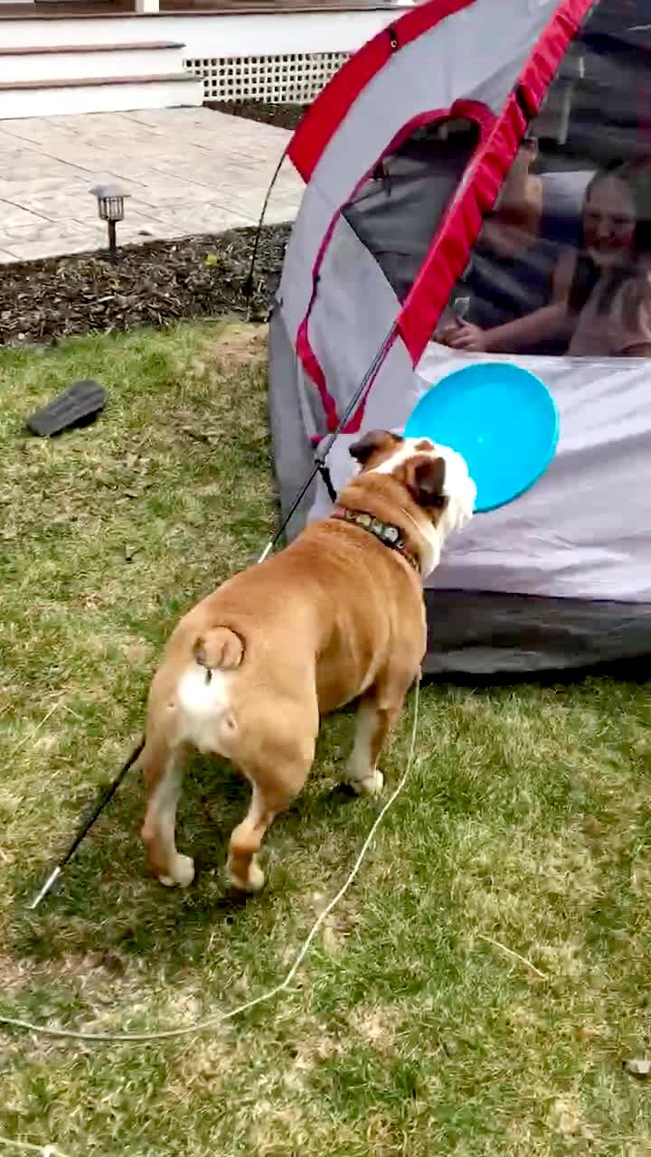 A woman and her young daughter sit in a tent and ask their bulldog dog to bring them his frisbee. The dog jumps on the tent and it collapses, then he walks to the entrance and the woman helps him inside.
