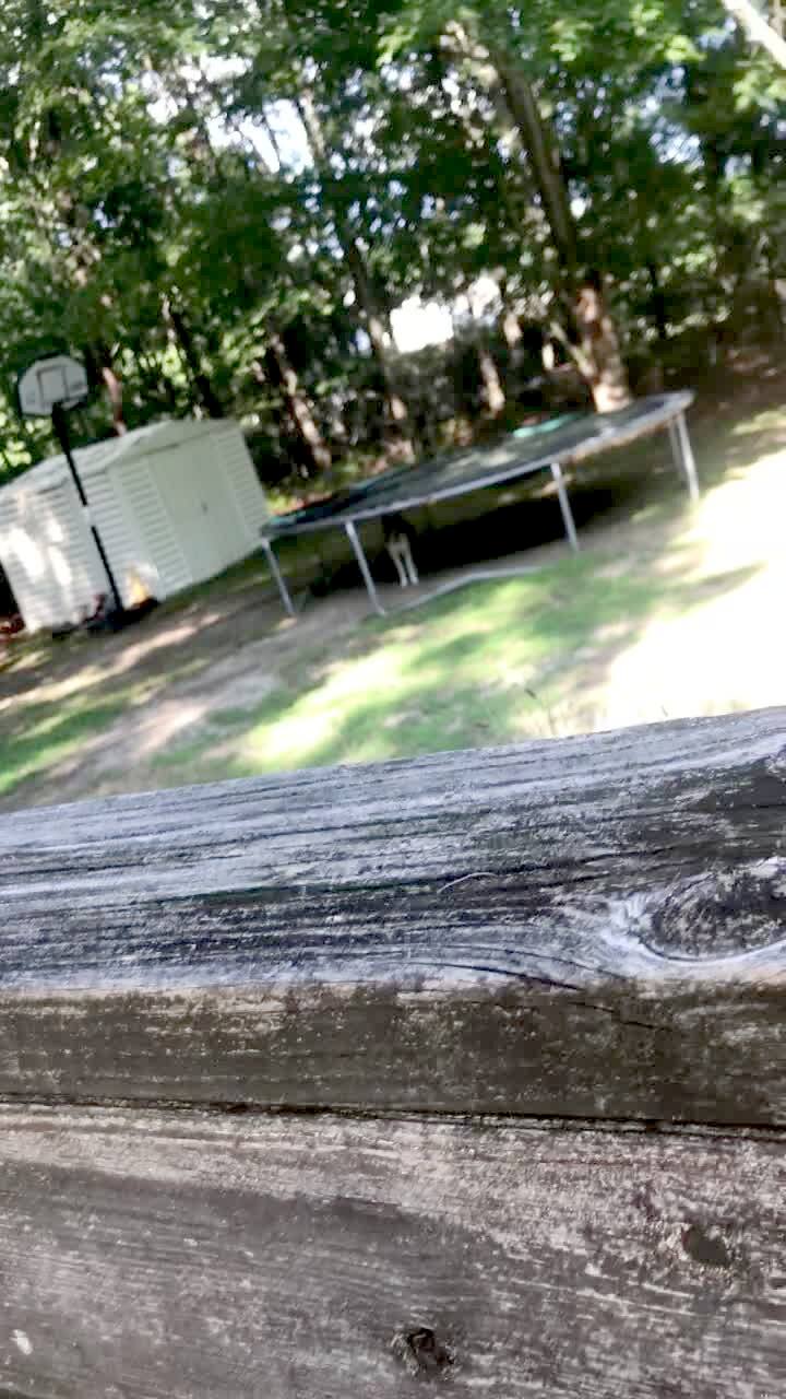 A dog runs to a woman in the backyard and moves a frisbee closer to her when she says she can't reach it.