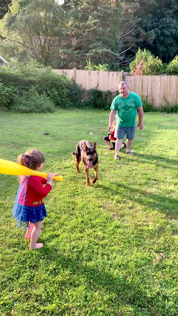 A german shepherd dog jumps in front of a tot girl and grabs a plastic baseball out of the air when her father throws it to her.