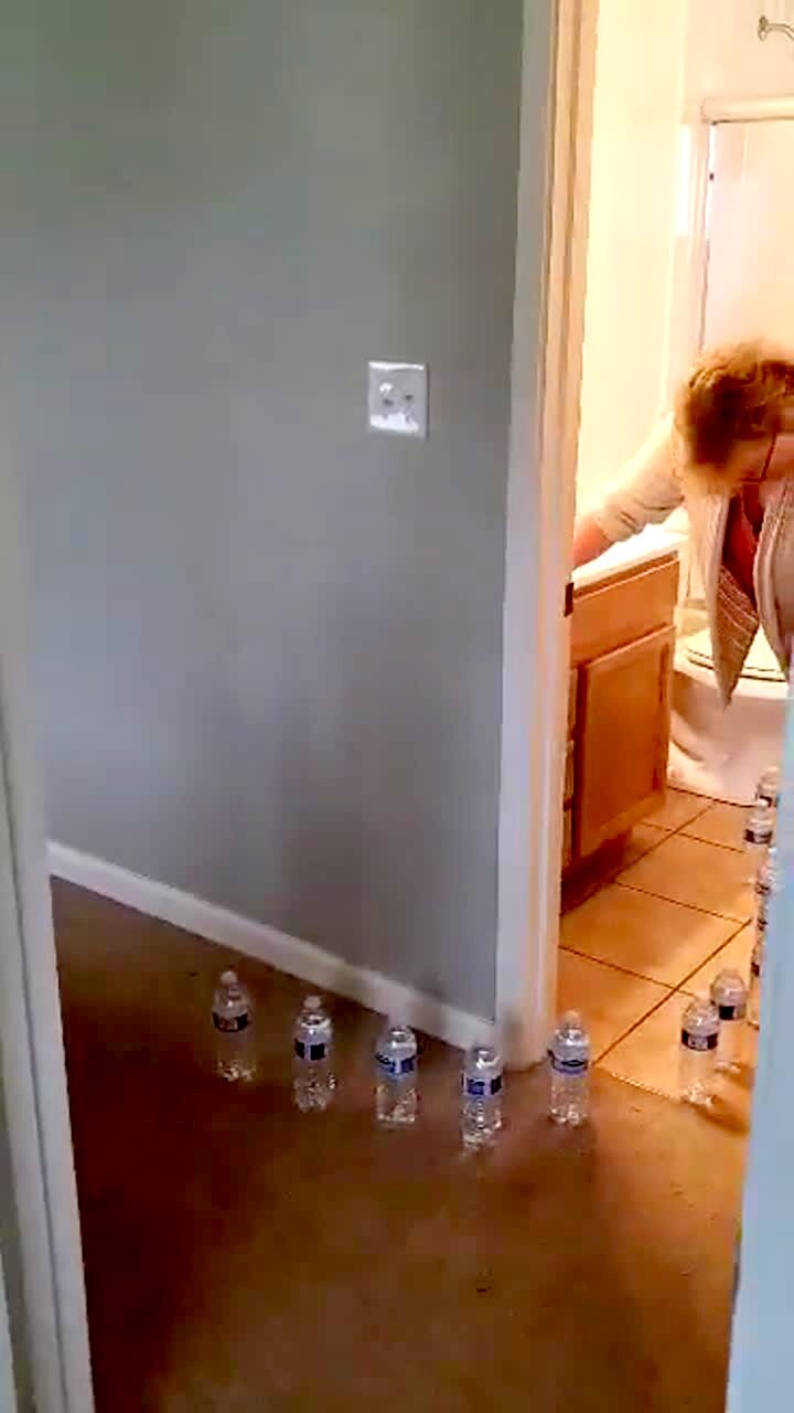 A woman runs into her garage and hits her head on the door as she doesn't look ahead.