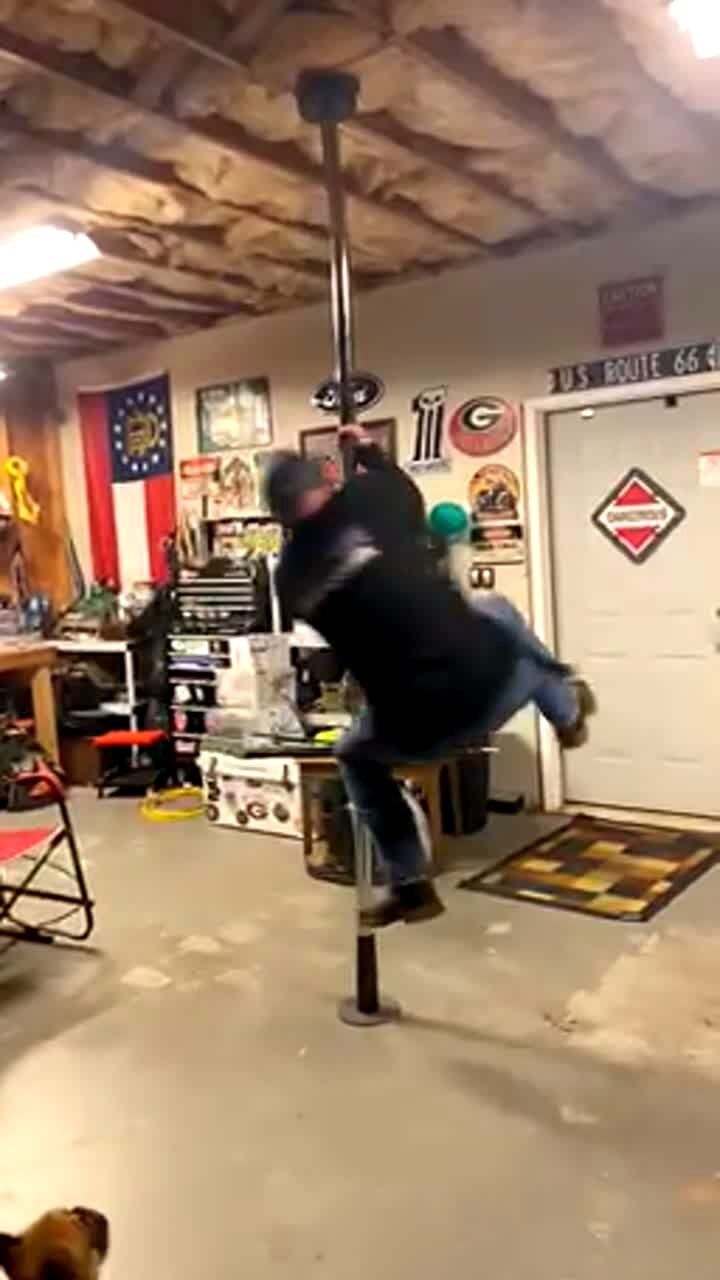 A man dances to music in a kitchen and a young boy dances and battles him and their family laughs. The man does a handstand but kicks a kitchen window and breaks it.