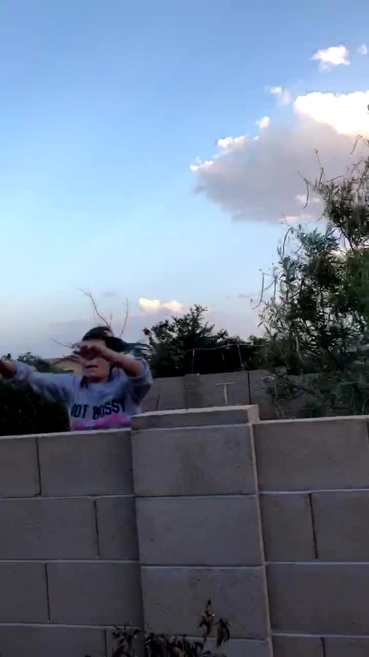 A young girl falls in to the rock filled planter in the backyard when she loses her balance as she sits on top of a concrete wall after she jumps on top of the wall when she throws a volleyball back in to her yard.