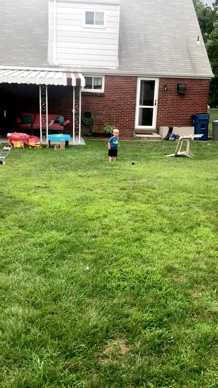 A tot boy bounces a ball that ricochets and hits him in the face repeatedly in the backyard.