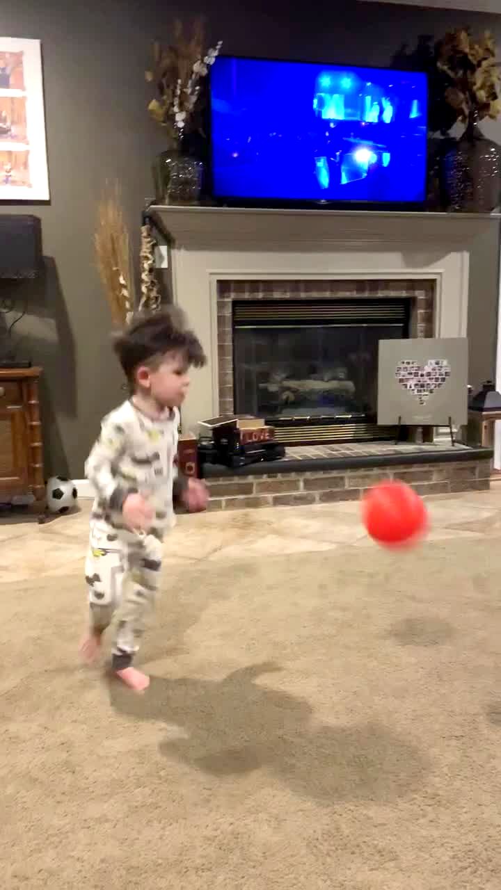 A tot boy makes almost every shot into the basketball goal in the living room.
