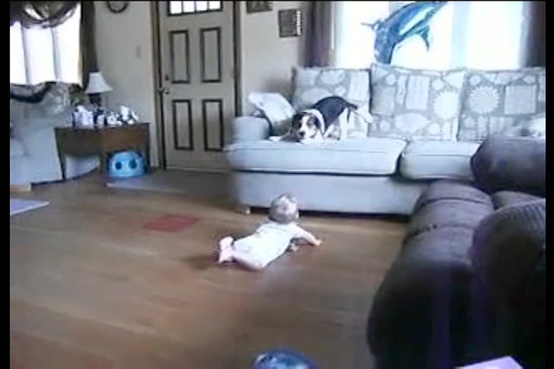 Beagle dog on the couch barks at baby boy laying on the hardwood floor. Baby laughs, dog runs around & spins in the baby's face.