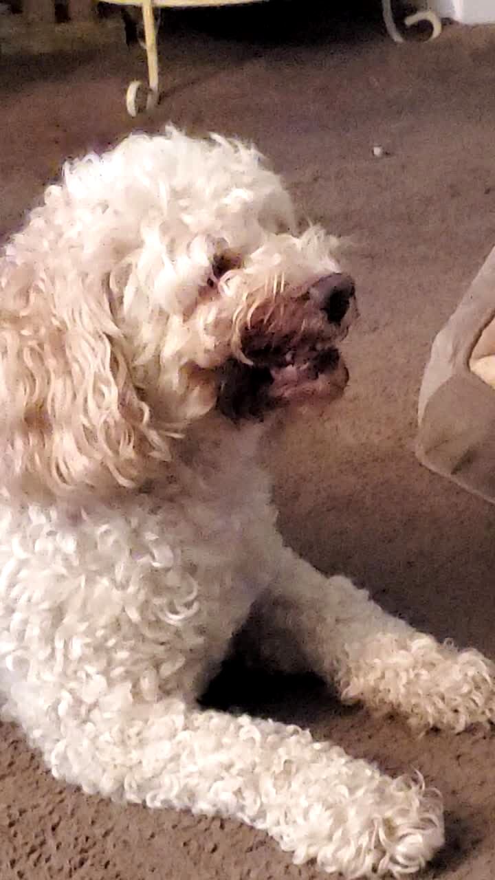 A Maltese dog holds a baby toy that vibrates in her mouth at home, and two women laugh at her.