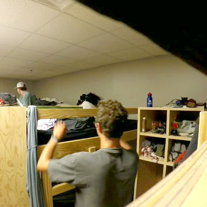 Man on bottom bunk pushes up on top bed, thinking he'll pop man out, & the mattress & top man crash onto bottom guy instead. Boneheads. Dorm room that looks like a crack house. College.