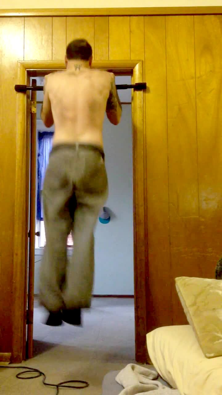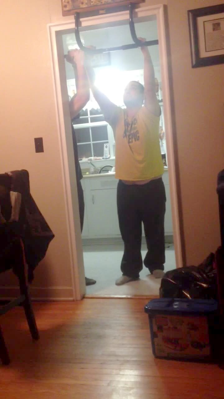 A man uses a pull up bar in a door frame. The frame partially breaks and the man falls.