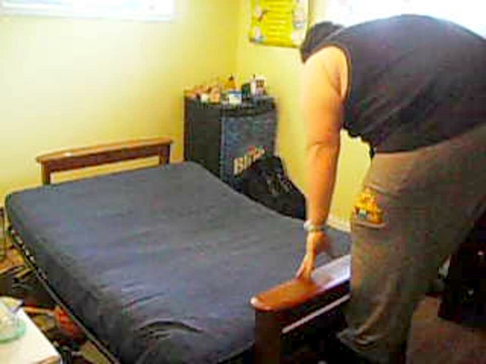 Heavy man stands on the end of a twin bed and falls on the floor.