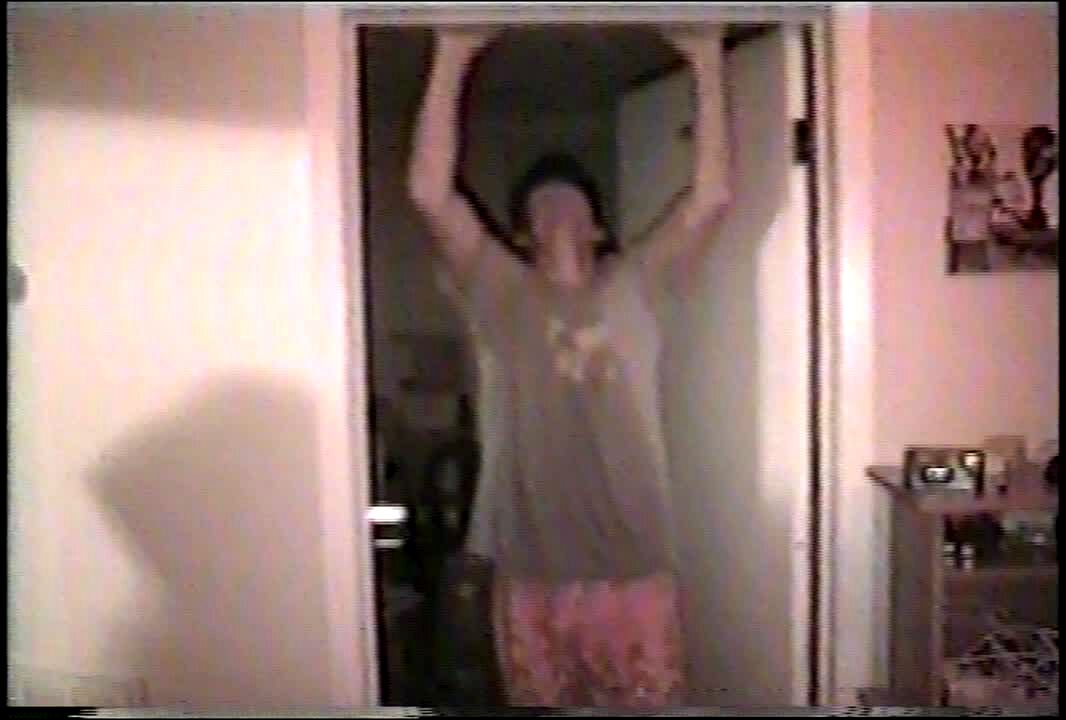Man hangs from a doorway & slowly flips backwards but the door piece breaks. Man falls on his head. Bonehead. With recovery.