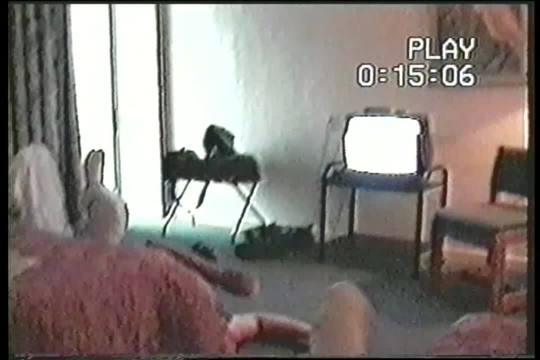 Man stands on a floor buffer in the house and spins around. He falls off. No tails.