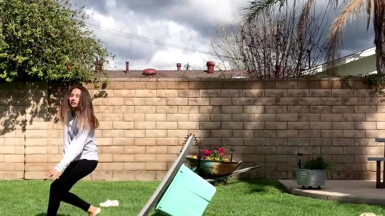 A teen girl does a cheer routine on top of a bucket and board but she tops it over and falls. No audio.