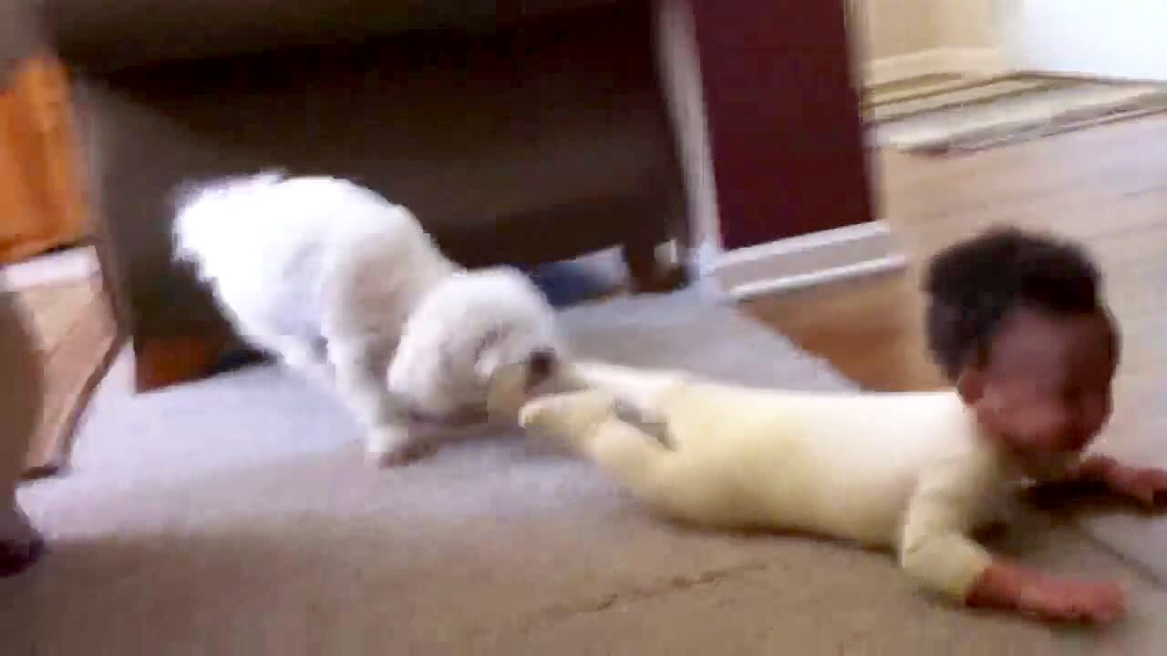 Small white dog bites at infant baby boy's pajamas. Dog drags baby on floor.