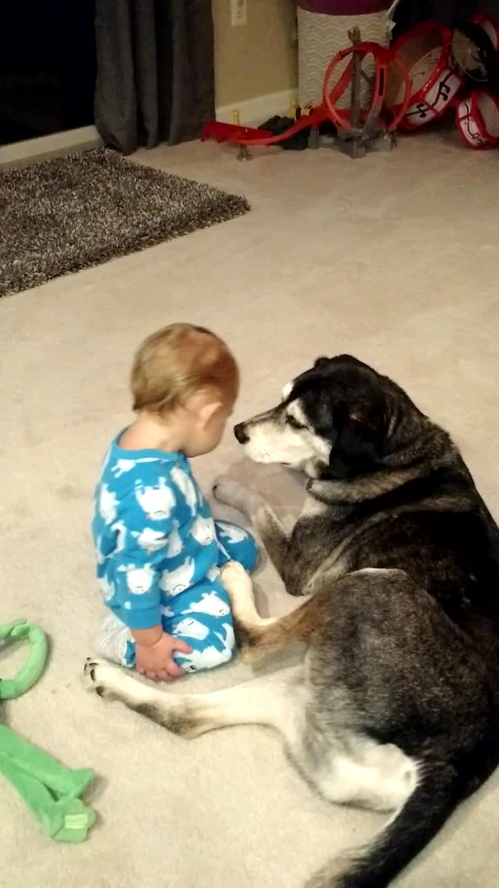 A tot boy sits next to his dog in the living room indoors and falls asleep while the dog licks him. At the end the boy falls asleep on the dog.