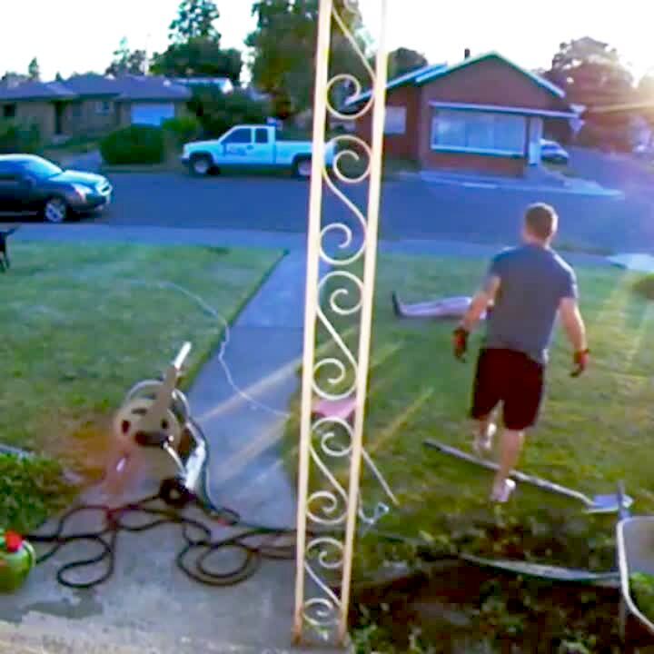 Teen boy tries to make a shot by bouncing basketball off propane tank in yard. The ball bounces and hits him in the groin instead, and he falls. .