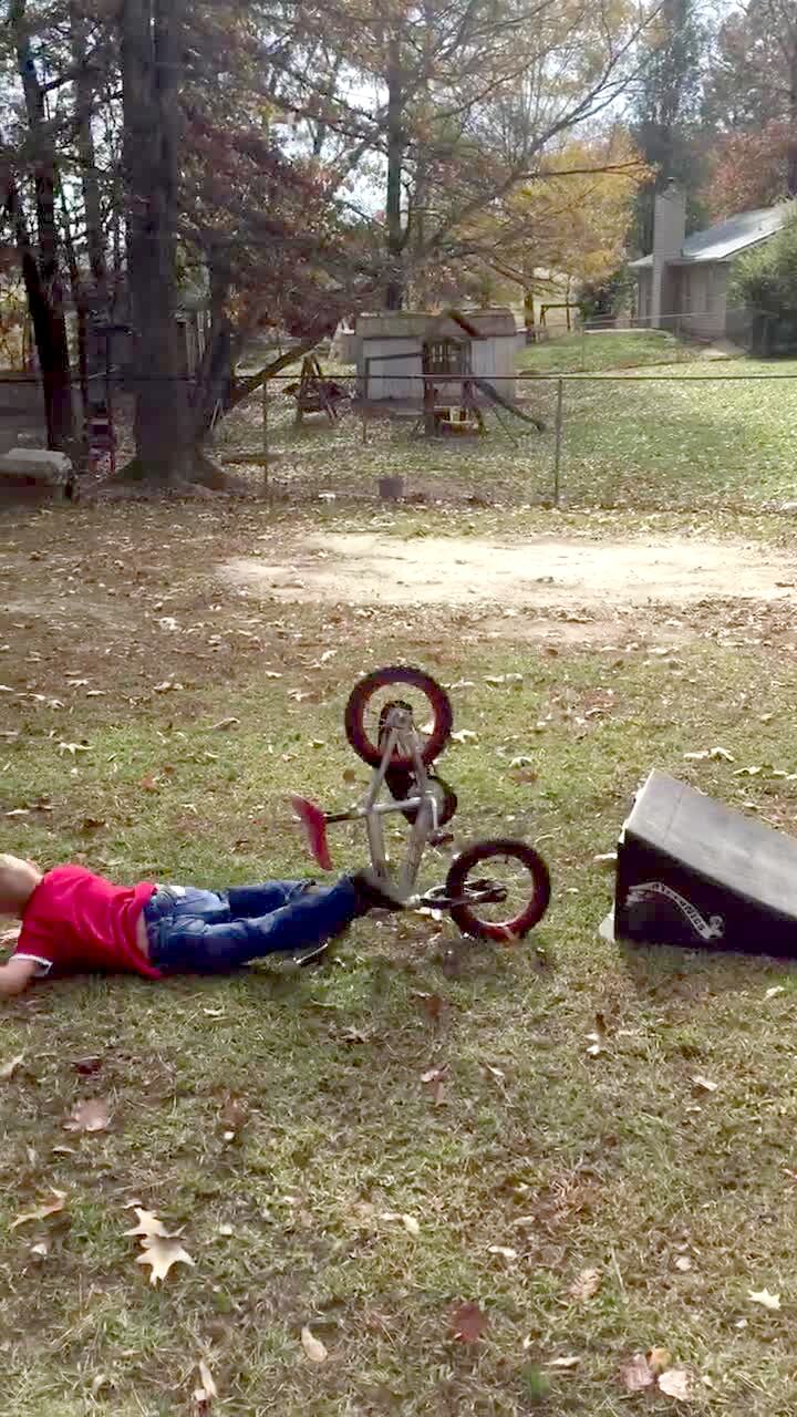 Four-year-old boy skateboarding, falls and then the board rolls into his crotch / groin / balls.