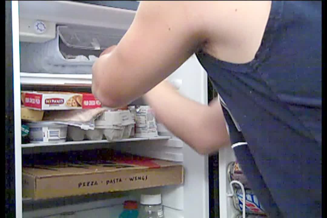 A teenage girl falls to the floor standing on a kitchen stool trying to dance with friends.