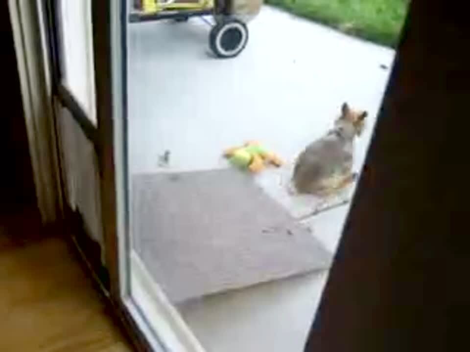 A senior man runs across his patio with just a towel on. He tries to avoid his excited dog but the dog pulls his towel off as the man runs into the house.