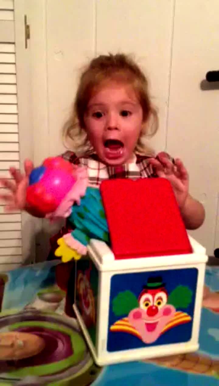 A tot girl says her dad has her toy monkey, then she turns around and points at the door and the monkey hangs from her pony tail, then he mom tells her it is on the back of her head and she gets excited.