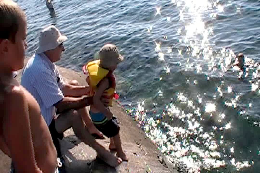 Baby girl drinks from a sippy cup. On the side of the frame, dog briefly scoots across floor dragging its butt. Very quick.