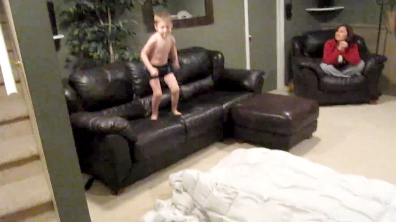 A young boy attempts to walk from a living room chair onto a stool, before it collapses under him and he falls. Security footage