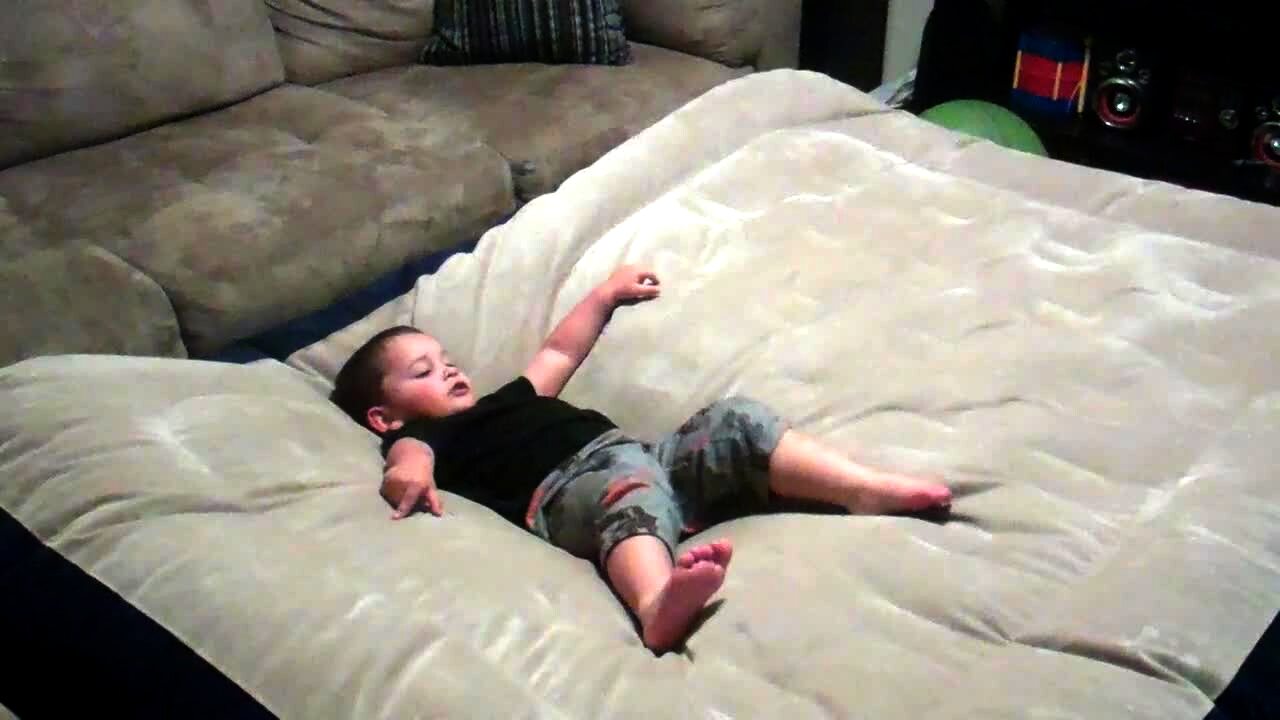 Tot boy lies on air mattress on living room floor, dad jumps on to launch boy, boy lands sitting on couch.
