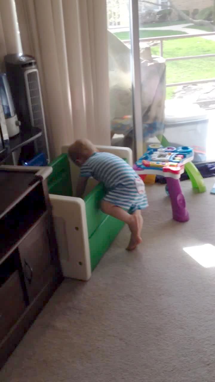 A baby boy leans against the outside of his tot brother's crib pen in the bedroom and the tot boy climbs up on the top of the wall and flips over and falls out.