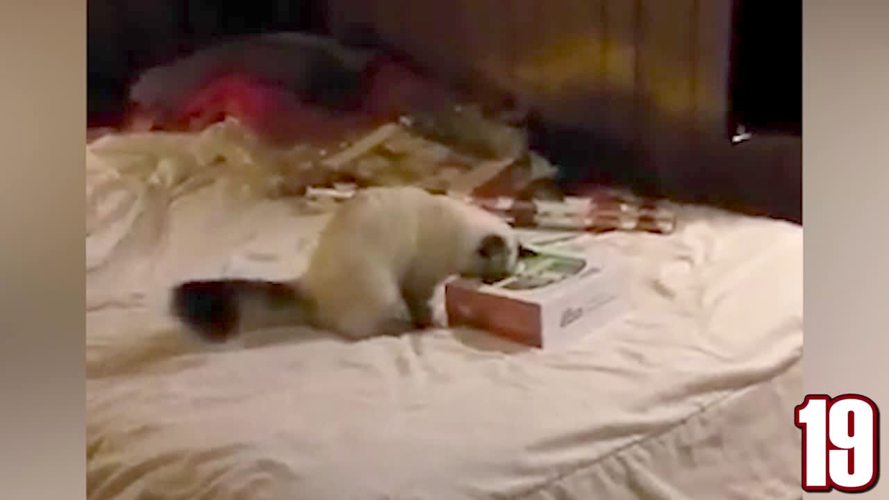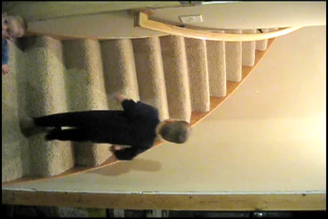 Tot boy walks up a flight of stairs. Another tot boy slides down the stairs on a mattress and knocks him over. Sideways video.