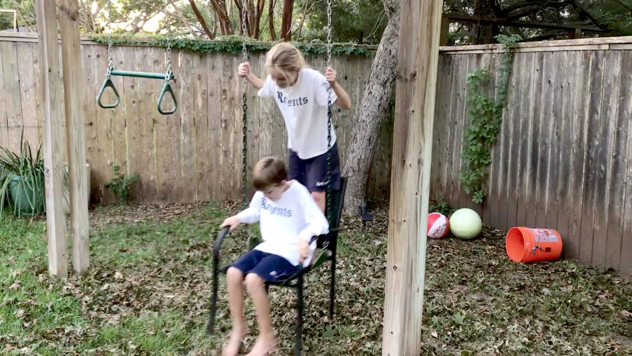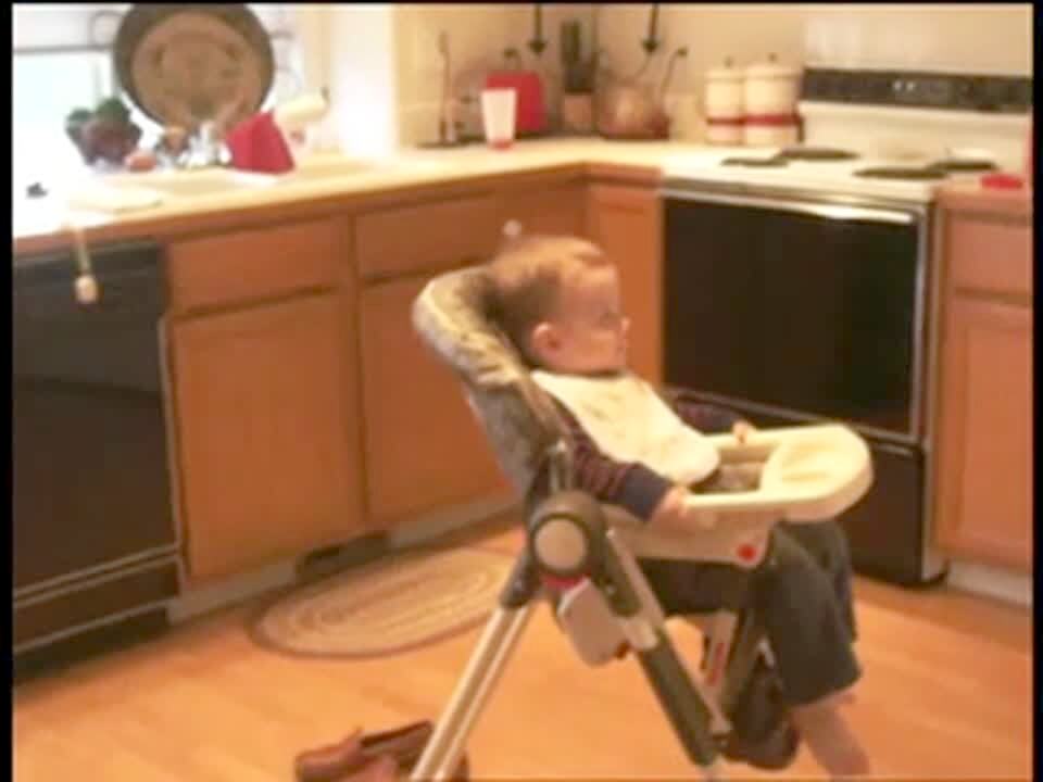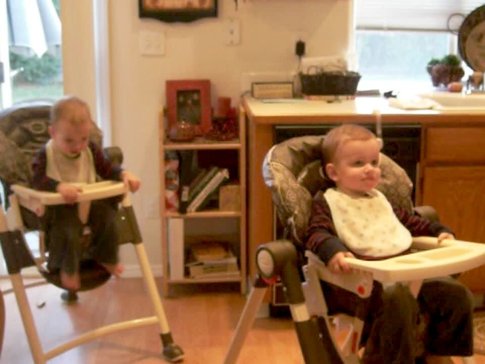 2 tot boys bounce back and forth in their high chairs, each causing the whole chair to scoot along the kitchen floor.