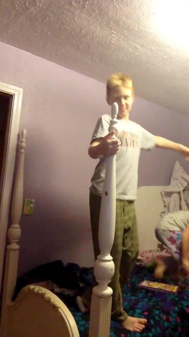 A young boy dances on his sister's bed and breaks one of the posts and falls down.