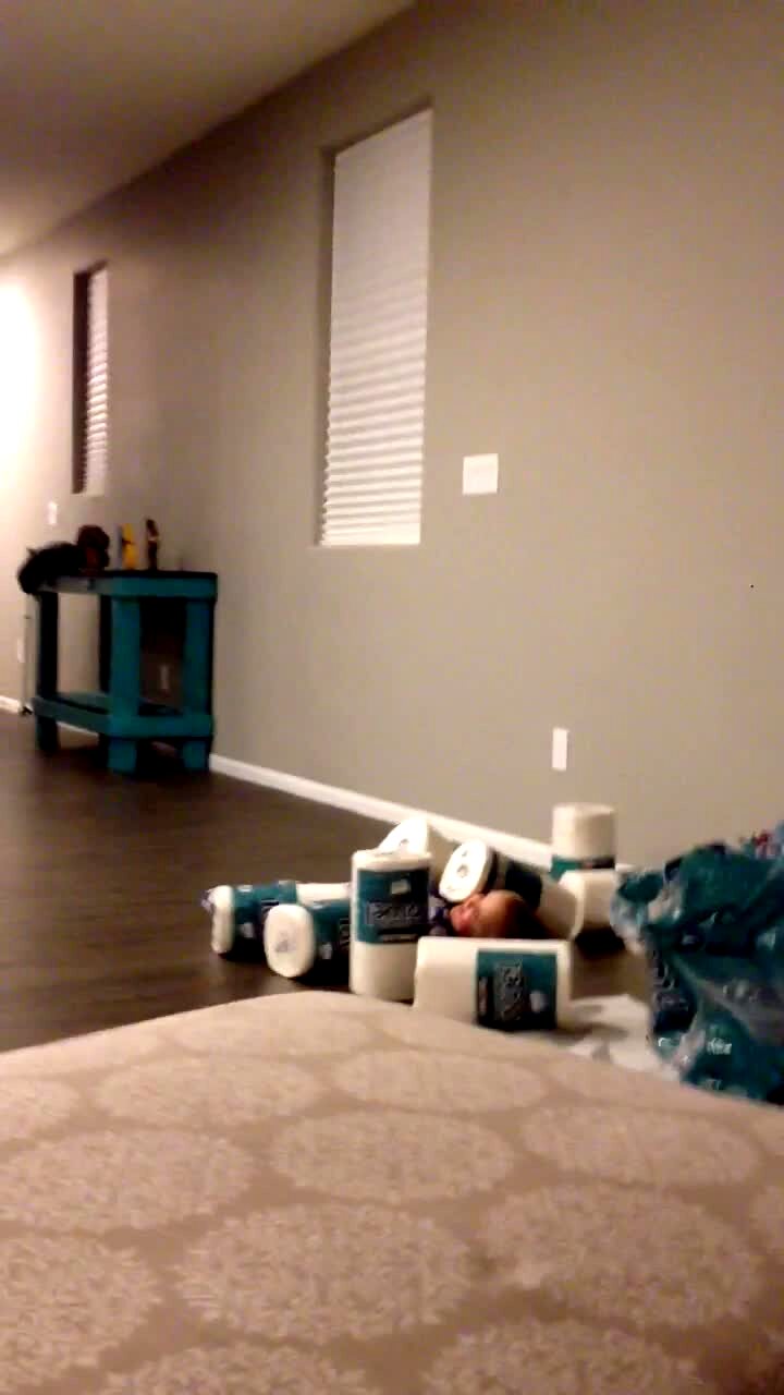 A man slides his son on a hardwood floor through a stack of paper towels.