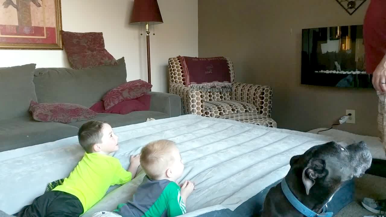 Two tot boy brothers lay on an inflatable mattress and their dad jumps onto the mattress. The boys fly into the air and flip over in sync and their mom and dad laugh.