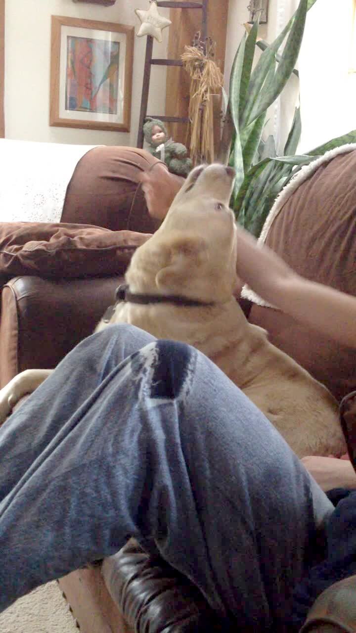A yellow lab dog sits next to a woman on the couch and each time she stops petting him, he picks her arm up with his nose and moves it over him.