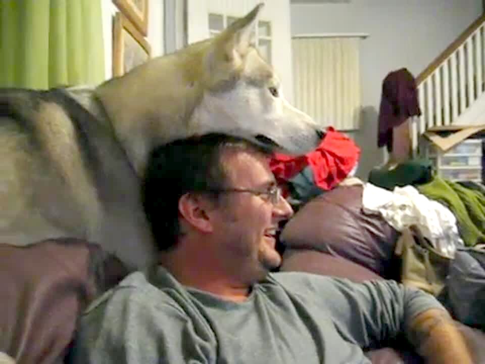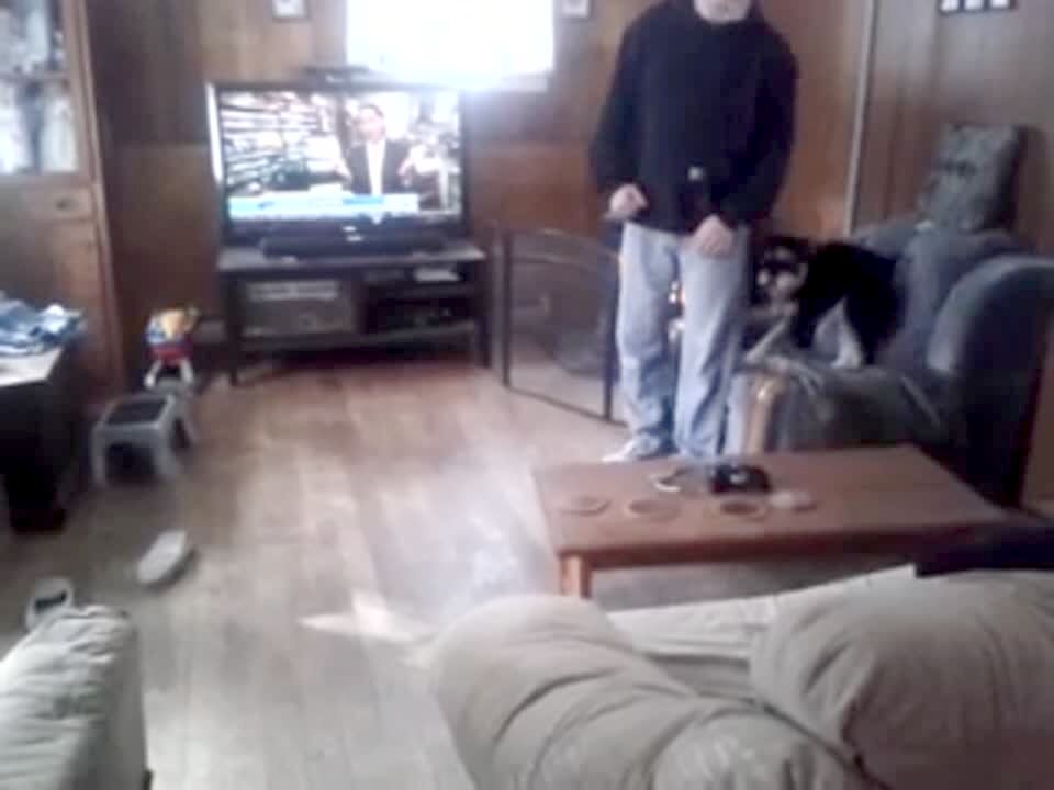 Big dog jumps on man in a recliner chair, sends him falling down to the floor.