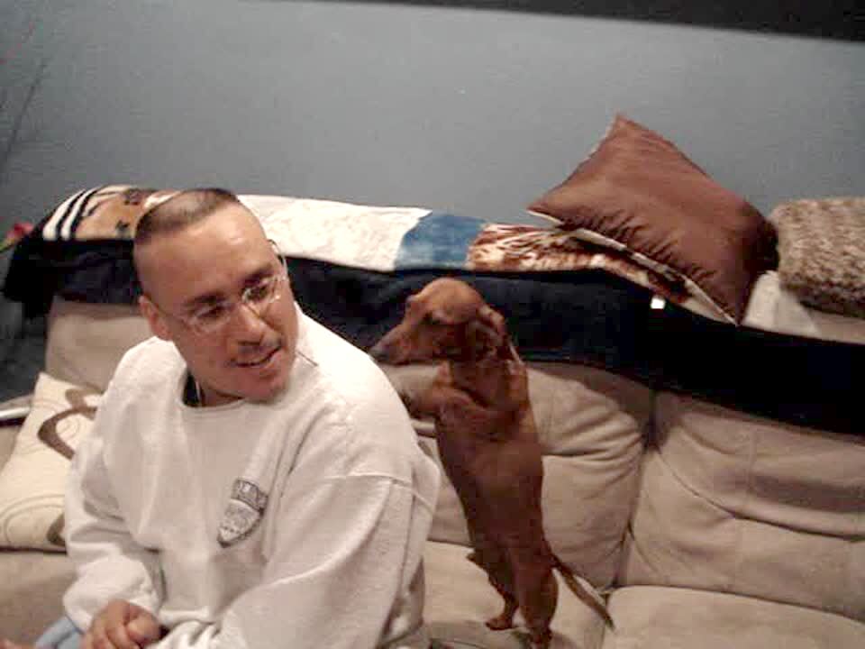 A man pets a puggle dog as they sit in a chair together. When the man stops petting the dog, the dog paws at the man's hand and pulls it to him so he can keep petting. Best action in first 30 seconds.