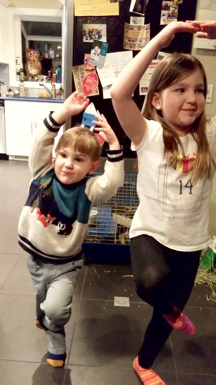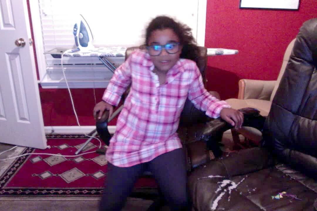 Girl dances, cheerleads on chair in bedroom, chair tips over and girl falls on floor hard, brother comes in and asks, "Are you unconscious?"