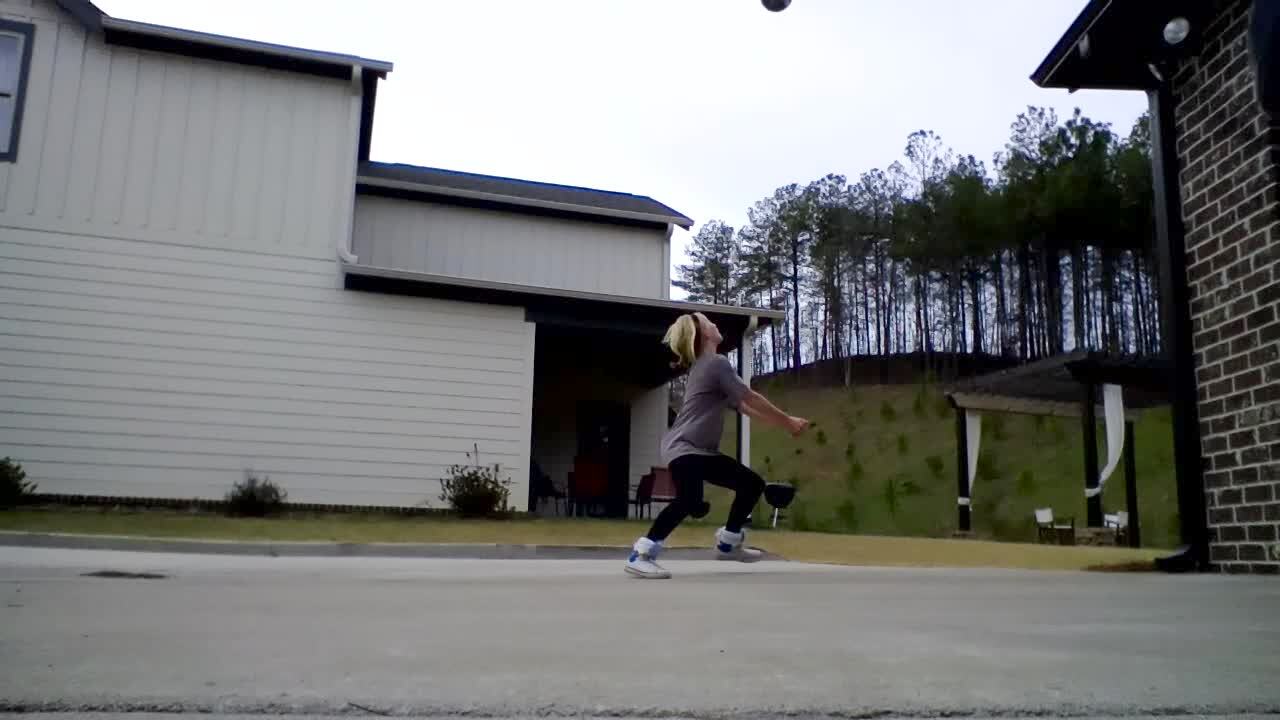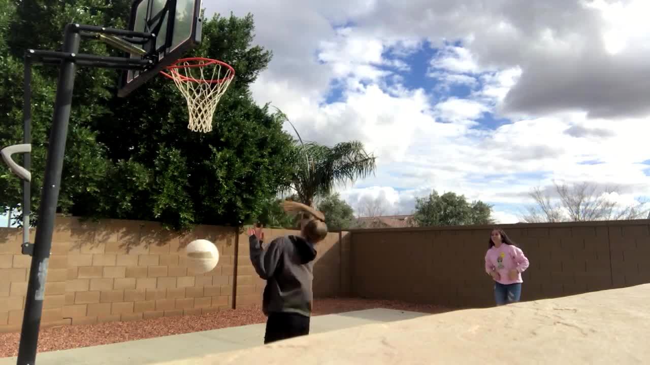 Teen boy shoots a basketball from a hill and hits the camera. Lens hit.