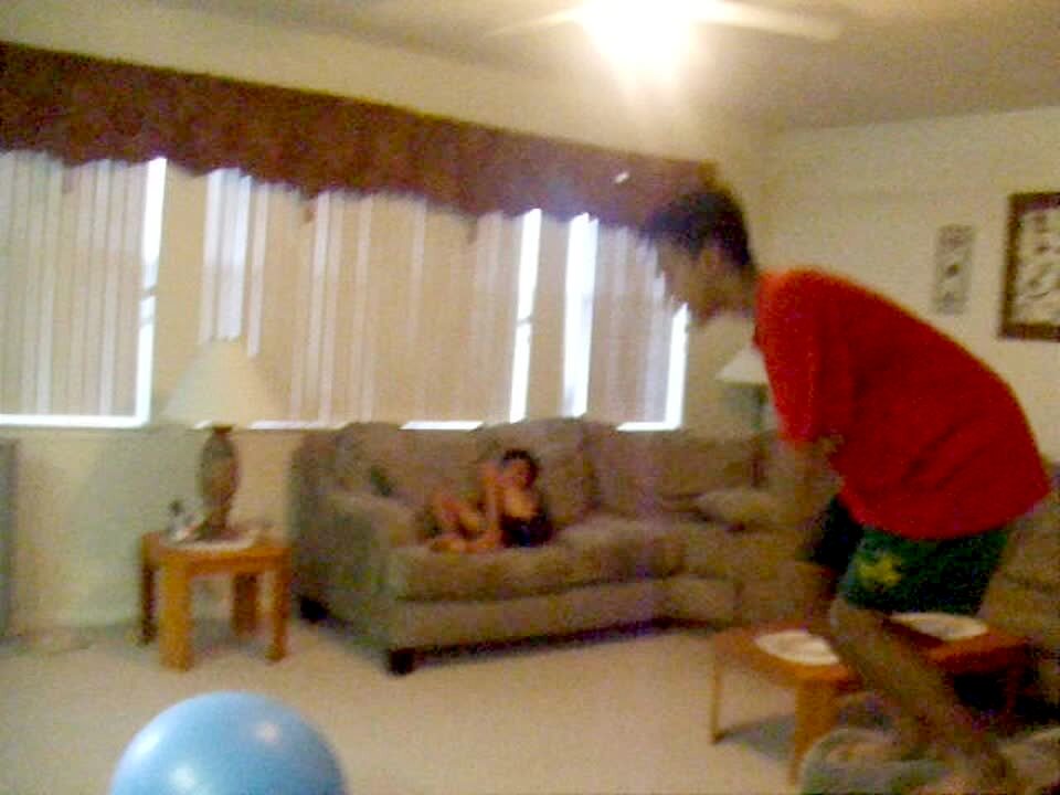Teen boy tries to make a shot by bouncing basketball off propane tank in yard. The ball bounces and hits him in the groin instead, and he falls. .