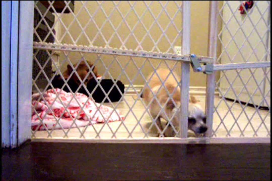 "The Great Escape" 2 Chihuahua dogs sit behind a doggy gate. 1 squeezes through the fence and pulls the gate down. He is stuck in between the bars and flails around.
