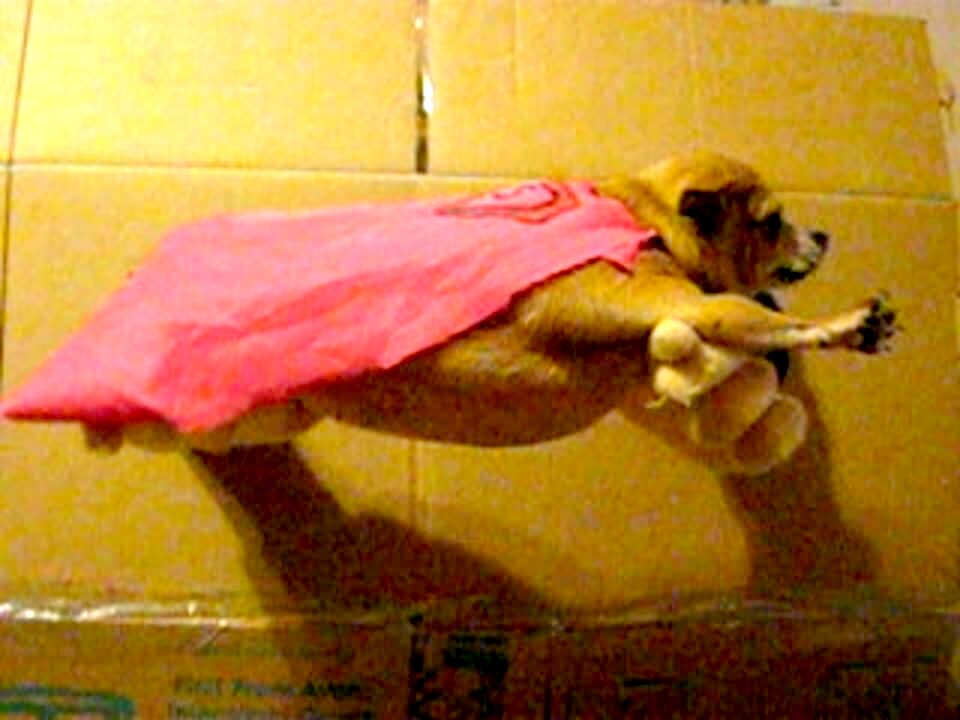 Man holds up a chihuahua dog through two holes in a box so the man can't be seen. The chihuahua dog holds its arms out like it's flying like Superman with a cape on.
