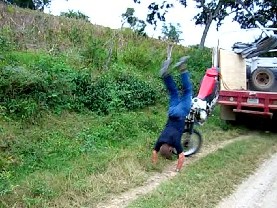 Man drives a motorcycle out of the back of a pickup truck on a dirt road, flips over the handle bars, and falls down on his face.