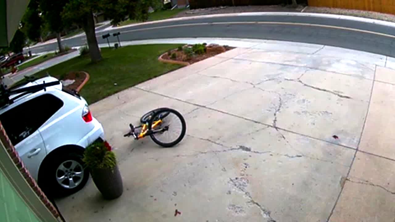 A car, with a bicycle on top, drives into a home garage. The bicycle crashes into the top of the garage door and slides off the car. Home security camera video.