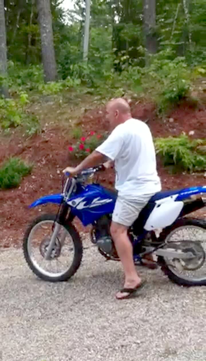 A man rides a miniature motorcycle on his driveway but he crashes immediately.