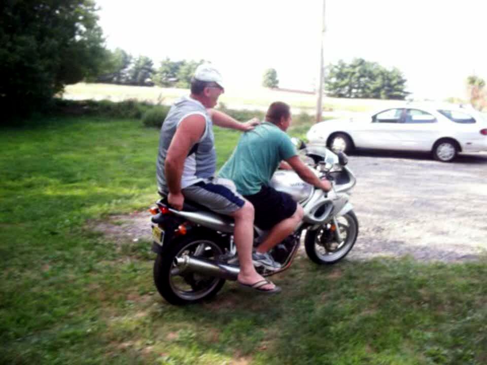 A man starts a motorcycle and it drives out from underneath him, tossing him to the ground.