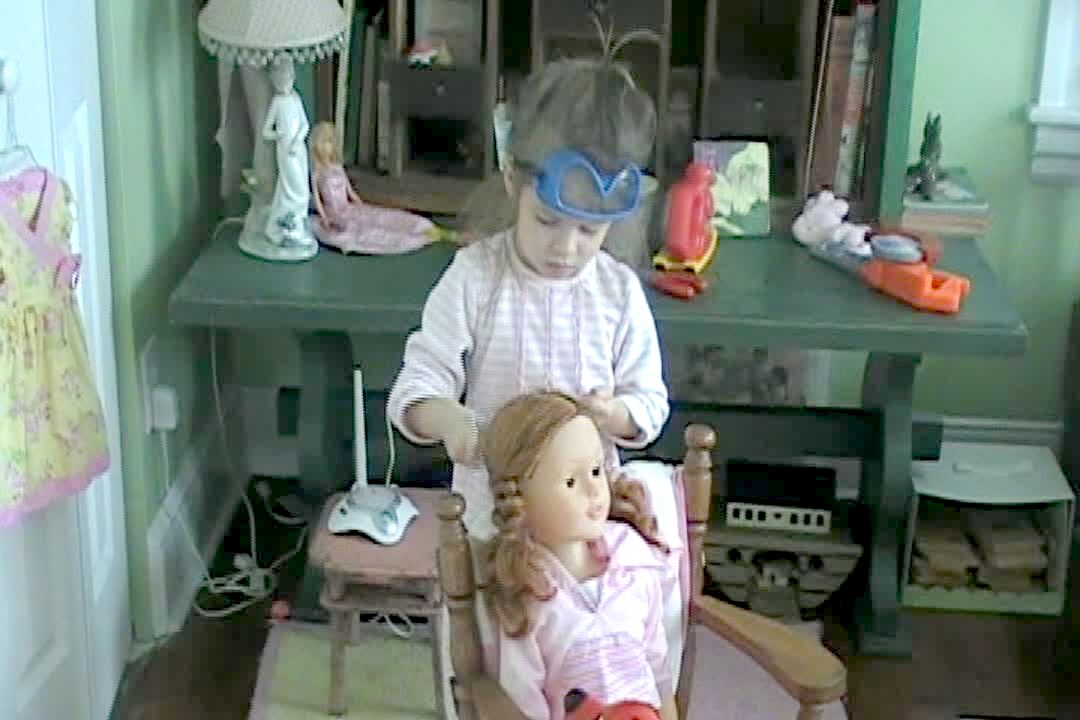 "Dad Hair Day" A man struggles to put a tot girl's hair into a pony tail at home. When he puts the band on her hair, it springs off and her hair pops up in two parts.
