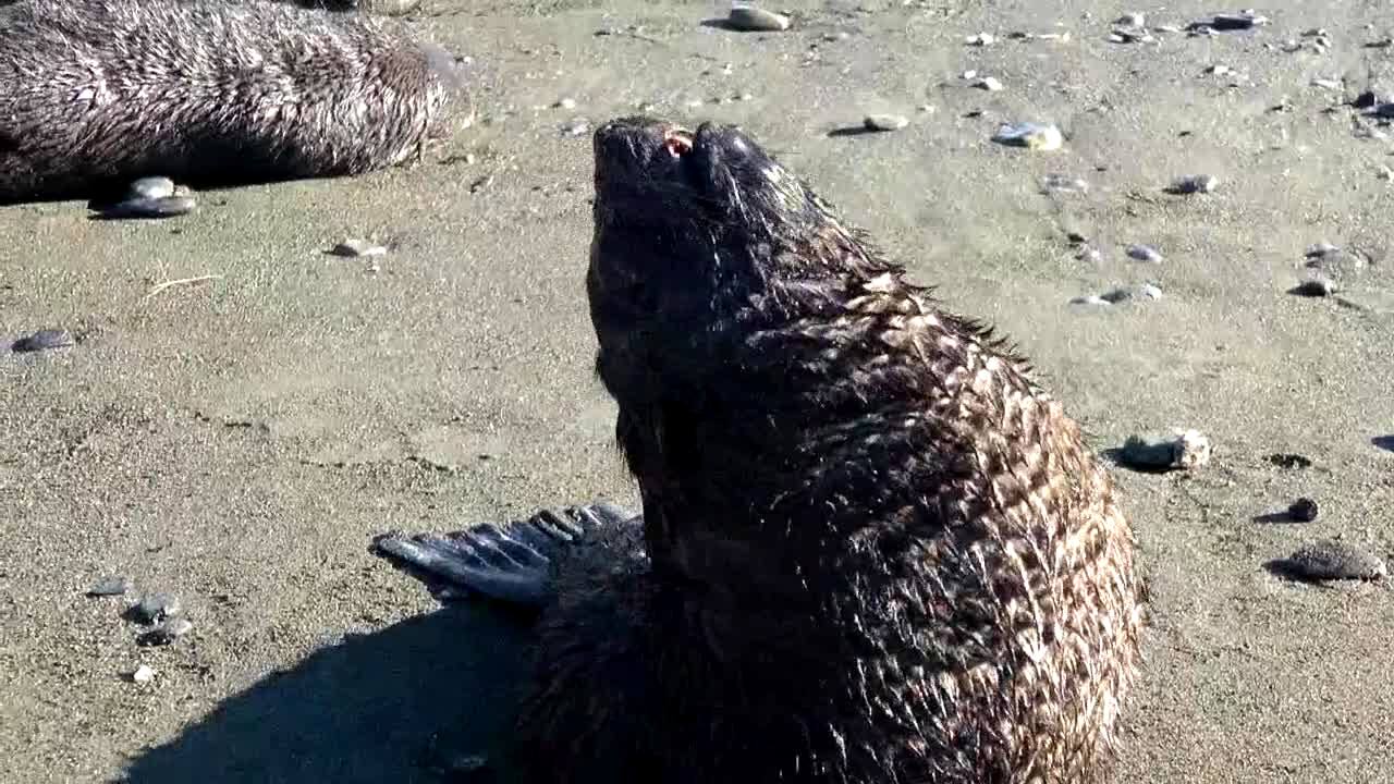 Montage of seal pups on muddy beach. Seal poses for camera at :16 and seal smells/ checks out camera at :36. cute